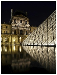 Stunning view of the Louvre Pyramid illuminated at night, reflecting in the water.