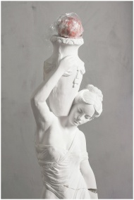 A classic white statue holding a modern element, contrasting traditional art with contemporary ideas.