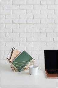 A clean and organized desk setup with a laptop, cup, and notebooks against a white brick wall.