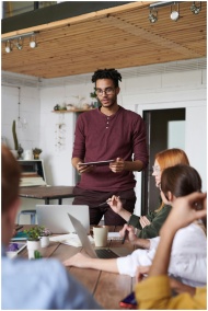 Young professionals engaged in a brainstorming ses