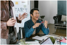 Engaged team members in a lively office meeting discussing startup ideas and innovation.