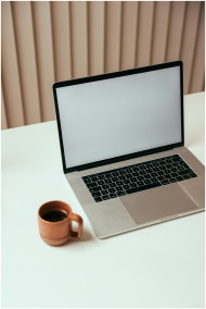 A minimalist workspace with a laptop and a cup of coffee on a clean desk, perfect for technology or productivity themes.