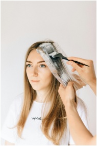Woman getting blonde hair treatment in a salon wit