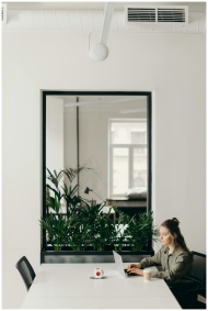 A young woman working on a laptop in a minimalistic, modern office setting with plants and a cup of coffee.