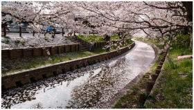 A serene spring view of cherry blossoms in full bloom over a tranquil canal.