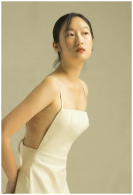 Graceful portrait of an Asian woman in a beige dress, showcasing elegance and fashion.