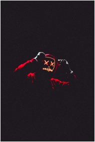 A person in a glowing neon mask and hoodie in a dark, ominous setting.