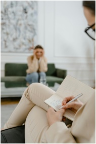 A therapist takes notes in a modern office setting during a therapy session with a patient.