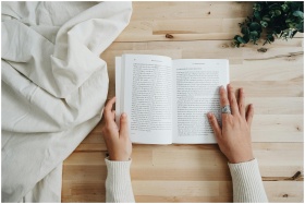 Top view of a person reading a book on a wooden table with a cozy setup, ideal for leisure and learning concepts.