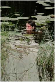 A mysterious figure with painted face emerges from lily pad-covered pond, evoking mythical themes.