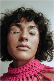 A close-up portrait of a woman with eye-catching creative makeup and a vibrant pink top.