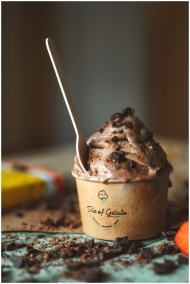Close-up of chocolate gelato in a branded cup with