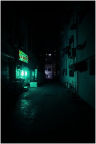 Dark alleyway at night featuring an eerie neon-lit