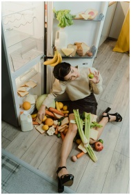 Conceptual shot of a woman sitting on the floor with spilled groceries, depicting consumerism and chaos.