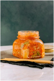 Close-up of homemade kimchi in a jar with chopsticks on a table.