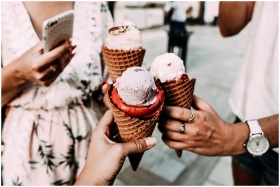 Crop anonymous friends in casual summer clothes clinking delicious cone ice creams while gathering on street