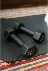 Black 10 lb dumbbells placed on a yoga mat indoors