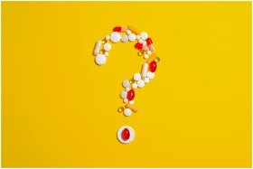 Assorted pills and capsules arranged in a question mark on a bright yellow background symbolizing medication inquiries.