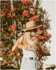 Woman with long blonde hair in a straw hat walking