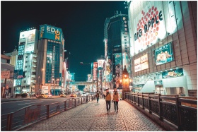 Urban Japan cityscape at night with illuminated buildings and people walking along the street.