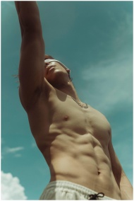 Shirtless man reaching upwards under a clear summer sky, showcasing fitness and freedom.