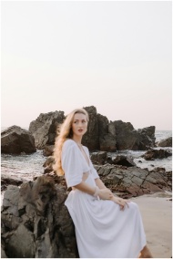 Elegant woman in a white dress sits by rocks at a serene beach.