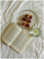 Inviting still life with open book, fresh figs, and a flower on a white sheet.