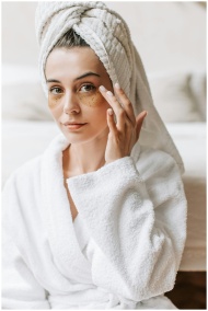 Portrait of a woman with a towel on her head applying under-eye patches for skincare routine.