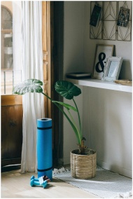 A serene corner of a home featuring a plant, yoga mat, and dumbbells for a healthy lifestyle.