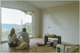 A couple with their dog resting in a partially renovated room, planning the renovation.