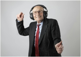 Happy senior man in formal attire delighting in music with headphones on a white background.