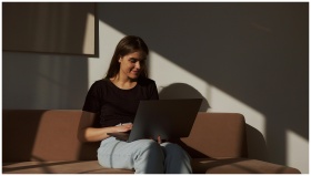 Casual woman enjoying free time browsing laptop on sofa indoors.