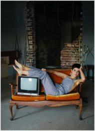 Stylish woman posing on vintage sofa with an old TV in a rustic setting.