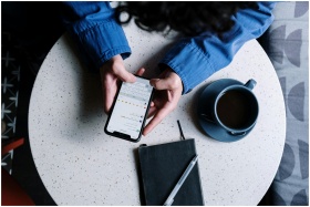 Person using smartphone at table with notebook and coffee, ideal for tech and lifestyle themes.