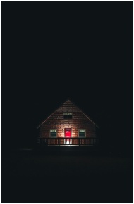 A captivating wooden house with a red door, illuminated at night in a moody setting. Perfect for architectural and real estate themes.