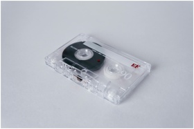 Close-up of a vintage cassette tape with clear casing on a white background, highlighting audio nostalgia.