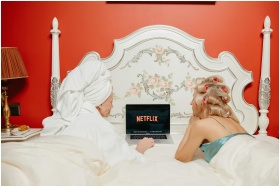 Two women lying in bed watching Netflix on a laptop, creating a cozy and bonding atmosphere.