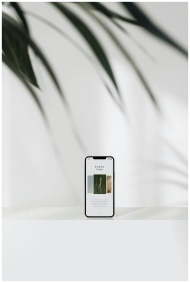 Modern smartphone showcasing a website with minimalist design and plant shadows.