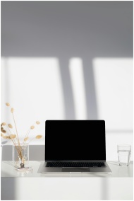 A clean and sunny minimalist workspace with a laptop, glass of water, and decorative vase.