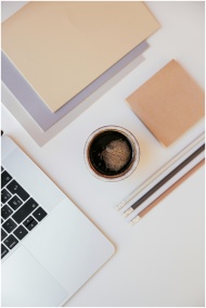 Top-down shot of a workspace with coffee, laptop,