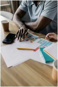 Two business professionals collaborating on a colorful project plan indoors.