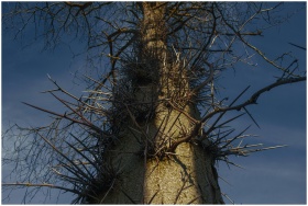 Close-up of a spiny tree under a dramatic fall sky, capturing nature's intimidating beauty.