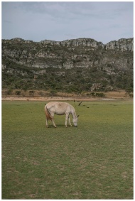A white horse grazes peacefully on a green field with rocky mountains in the background.