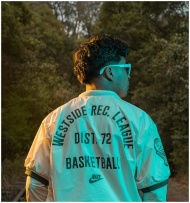 Person in sunglasses and jacket outdoors, vibrant colors.