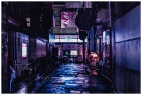 A vivid night scene capturing a wet alley in Tokyo