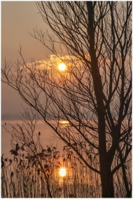 Peaceful sunrise reflecting over a calm lake framed by bare tree branches.