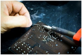 Hand soldering on a printed circuit board, showcasing electronic craftsmanship.