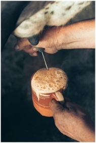 Hands milking a cow with fresh milk foaming into a ceramic mug outdoors.