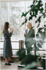 Side view of young woman in elegant dress standing near window in office and explaining new project to female colleague in formal outfit
