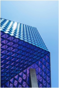 Low angle view of a modern building with reflective geometric glass panels against a blue sky.